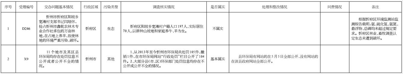 2017年5月2日晚,收到省群眾反映問題處置組督辦的第四批群眾反映問題共計(jì)2件。其中重點(diǎn)案件1件。我市高度重視,立即組織查處,截至5月5日,督辦的2件群眾反映問題已辦結(jié)。其中,確認(rèn)基本屬實(shí)1件、不屬實(shí)1件。對于環(huán)保部門存在處罰信息不公開或者公開不全的情況,各縣(市、區(qū))已于2017年5月5日前全部在政府網(wǎng)站或環(huán)保部門網(wǎng)站進(jìn)行了公開;對2件群眾反應(yīng)問題調(diào)查處理情況進(jìn)行了信息公開。