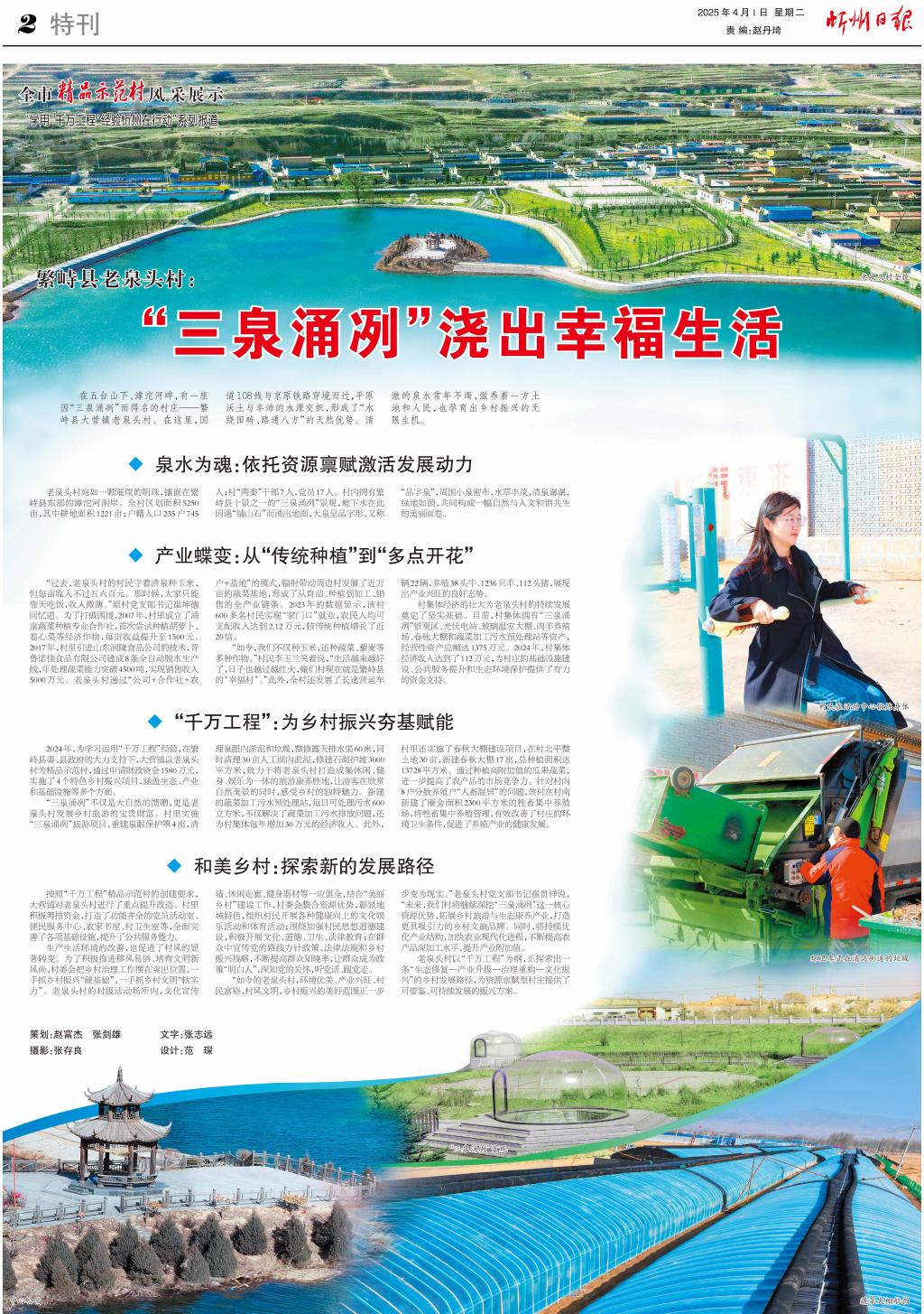 “如今的老泉頭村,環(huán)境優(yōu)美、產(chǎn)業(yè)興旺、村民富裕、村風(fēng)文明,鄉(xiāng)村振興的美好藍(lán)圖正一步步變?yōu)楝F(xiàn)實(shí)。”老泉頭村黨支部書(shū)記崔貴祥說(shuō),“未來(lái),我們村將繼續(xù)深挖‘三泉涌冽’這一核心資源優(yōu)勢(shì),拓展鄉(xiāng)村旅游與生態(tài)康養(yǎng)產(chǎn)業(yè),打造更具吸引力的鄉(xiāng)村文旅品牌。同時(shí),將持續(xù)優(yōu)化產(chǎn)業(yè)結(jié)構(gòu),加快農(nóng)業(yè)現(xiàn)代化進(jìn)程,不斷提高農(nóng)產(chǎn)品深加工水平,提升產(chǎn)業(yè)附加值。