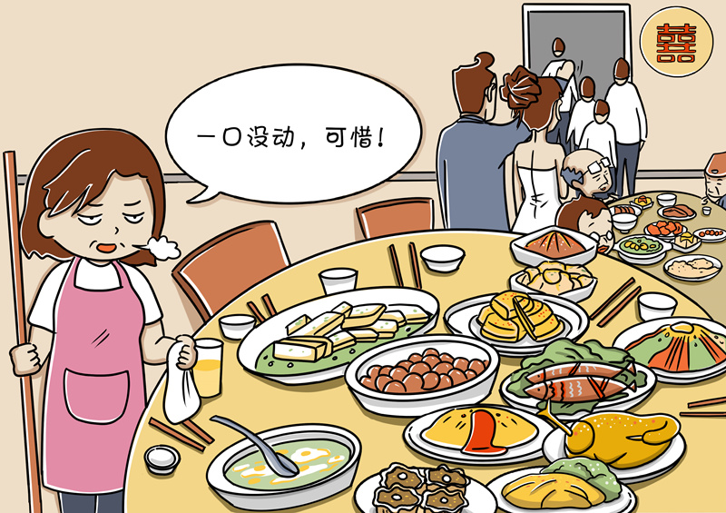 杜絕“剩宴”需要社會合力。結婚“剩宴”并不是短時間形成的,也不是個別現(xiàn)象,因此,根治這種陋習、在全社會培養(yǎng)節(jié)約意識和節(jié)儉習慣是一項長期任務,也是一項全民行動,需要社會各界多元化、多角度共同推進。比如,黨員干部以身作則,率先垂范;餐飲行業(yè)增強節(jié)約意識,改進服務,合理優(yōu)化供應標準。只有人人轉變觀念,共同做厲行節(jié)約、反對浪費的踐行者、宣傳者和監(jiān)督者,才能帶動形成良好社會風氣。(文字:馬若虎 漫畫:甘甜)
