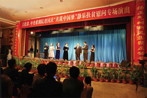 日前,文化部、中央歌劇院在靜樂縣舉辦了迎國慶“共筑中國夢”扶貧慰問專場演出。中央歌劇院的藝術(shù)家與當(dāng)?shù)馗刹咳罕娡_獻(xiàn)藝,共同重溫紅色經(jīng)典,熱情謳歌黨的光輝業(yè)績。整場演出薈萃眾多藝術(shù)名家,演員們激情演唱了《我們走在大路上》《我為祖國獻(xiàn)石油》《打起手鼓唱起歌》《草原上升起不落的太陽》等膾炙人口的經(jīng)典老歌,引起了觀眾強(qiáng)烈的共鳴,現(xiàn)場掌聲、歡呼聲、叫好聲連綿不斷。演出不僅給當(dāng)?shù)厝罕妿硪粓鼍始姵实奈幕⒀?,也激勵了干群齊心協(xié)力打好脫貧攻堅(jiān)戰(zhàn)的斗志,增強(qiáng)了百姓實(shí)現(xiàn)全面脫貧、全面小康的信心和決心。(小敏 攝)