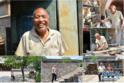 韓忠岐,男,1949年出生,山西省長治市潞城區(qū)垂陽村人,1976年起擔(dān)任村干部。從小熱愛學(xué)習(xí)的韓忠岐對鄉(xiāng)村發(fā)展有自己獨特的想法,他鼓勵村民們學(xué)習(xí)技能,在農(nóng)閑時“組團”外出打工,農(nóng)忙時鄰里互幫互助,曾經(jīng)貧窮的垂陽村在他的帶領(lǐng)下慢慢富裕起來。退休后,閑不下來的韓忠岐自學(xué)打鐵、電焊技能,現(xiàn)在成了鄉(xiāng)里小有名氣的鐵匠,經(jīng)常為貧困戶開展技術(shù)培訓(xùn)。 左上:韓忠岐肖像;右上:韓忠岐在挑選工具;右中:韓忠岐在制作一個鐵皮抽屜;右下:韓忠岐和老伴坐在院子里;下中:韓忠岐去鄰居家串門;下左:韓忠岐在院子里乘涼(拼版照片,6月18日攝)。 地處晉東南的山西省長治市,位于由太行山、太岳山環(huán)繞而成的上黨盆地中。在群山中、崖壁上,許多村莊自然條件惡劣,基礎(chǔ)設(shè)施落后,脫貧致富是大山深處人們的迫切心愿。 近年來,一場場脫貧攻堅戰(zhàn),在一個個深山村打響。政府全力探索脫貧路徑的同時,山區(qū)百姓因地制宜,靠自己的雙手和智慧走上致富路,交出了一份扎實的脫貧答卷。 記者在太行山、太岳山一路尋訪,記錄下多位70歲老人的生活。這些共和國的同齡人,親歷了山鄉(xiāng)的巨變,見證著長治山區(qū)脫貧攻堅偉大工程的一步步推進。 新華社記者 曹陽 攝