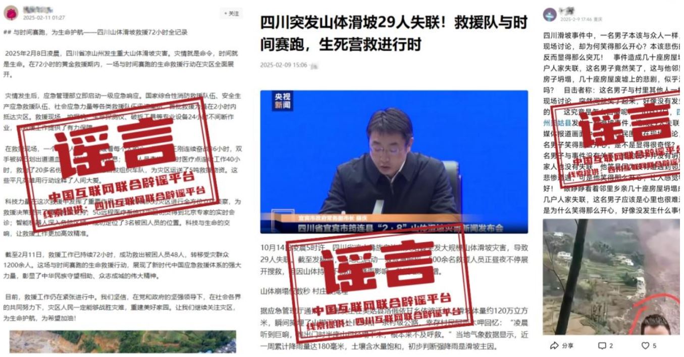 詳情:2025年2月8日,四川宜賓筠連發(fā)生山體滑坡已造成1人遇難、28人失聯(lián),2人受傷。全民救援關(guān)鍵時(shí)刻,部分網(wǎng)民為吸引流量博取關(guān)注,在網(wǎng)上捏造不實(shí)信息、散布災(zāi)情謠言、混淆大眾視聽,不僅擾亂了社會(huì)公共秩序,更對(duì)救援工作造成困擾。