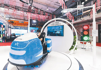 參觀者在2021世界5G大會展覽現場體驗5G+車聯網VR虛擬駕駛。新華社記者 任超 攝