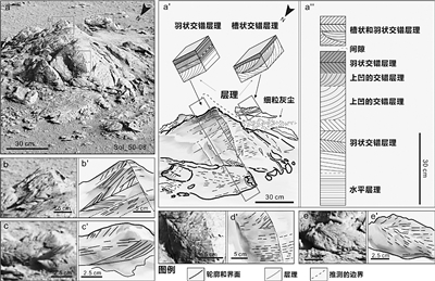 研究團(tuán)隊(duì)發(fā)現(xiàn),祝融段內(nèi)的巖石通常保留有局部呈透鏡狀的交錯層理組構(gòu),以多種小型交錯層理為主,伴隨少量透鏡狀壓扁層理和小型水道結(jié)構(gòu)的沉積構(gòu)造。其中,組成交錯層理的層系在兩個相反的方向疊覆傾斜,指示雙向古水流環(huán)境。