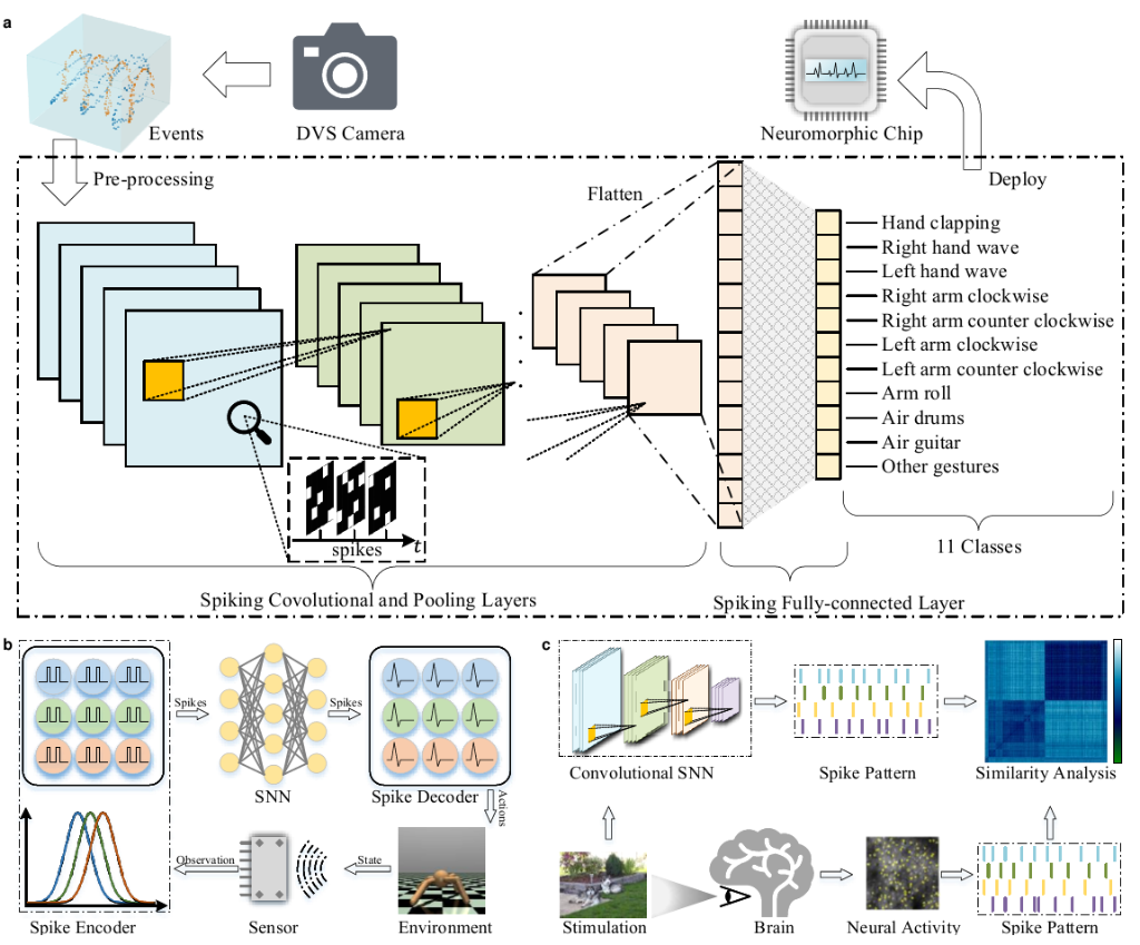 李國(guó)齊介紹,傳統(tǒng)脈沖神經(jīng)網(wǎng)絡(luò)框架更多地關(guān)注生物可解釋性,并不支持自動(dòng)微分,無(wú)法充分利用GPU的大規(guī)模并行計(jì)算能力,也缺乏對(duì)神經(jīng)形態(tài)傳感器和計(jì)算芯片的支持?!绑@蟄”框架很大程度上解決了上述問(wèn)題,支持神經(jīng)形態(tài)數(shù)據(jù)處理、深度脈沖神經(jīng)網(wǎng)絡(luò)構(gòu)建和神經(jīng)形態(tài)芯片部署等多項(xiàng)功能。