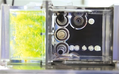 在問天艙生命生態(tài)實驗柜小型受控生命生態(tài)實驗模塊中,魚類、植物和微生物協(xié)同參與——藻類光合作用產(chǎn)生的氧氣供斑馬魚呼吸,魚呼出的二氧化碳供藻類進行光合作用,進食產(chǎn)生的糞便則提供了藻類生長的養(yǎng)料。在飲食方面,科學家專門設計了魚食,用注射器推進“魚缸”。