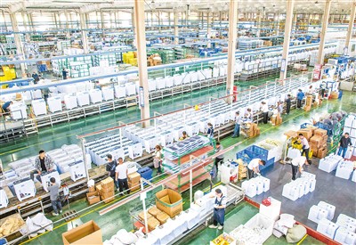 4月25日,在江蘇省宿遷市蘇宿工業(yè)園區(qū)的江蘇皓峰電器有限公司生產(chǎn)車間內(nèi),技術(shù)人員在生產(chǎn)加工銷往海內(nèi)外市場(chǎng)的智能洗衣機(jī)。陳少帥攝(人民視覺)