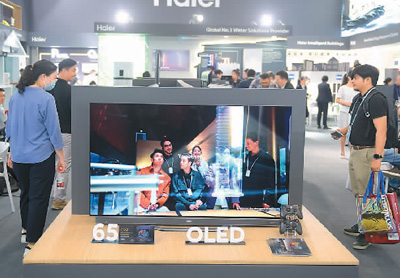 4月16日,在廣東省廣州市舉行的第135屆廣交會(huì)上,客商在了解、選購(gòu)海爾OLED電視。新華社記者 盧漢欣攝