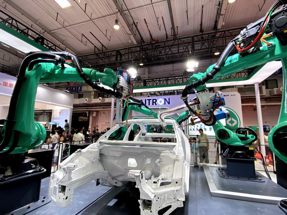 8月24日,在2024世界機器人大會展廳內,六軸機器人伸展鋼鐵手臂,為觀眾現場展示汽車自動化焊接技術。