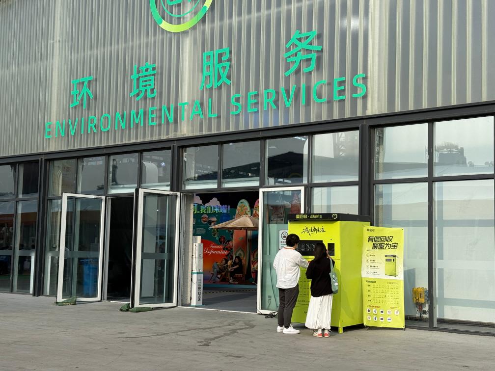 在2025年中國(guó)國(guó)際服務(wù)貿(mào)易交易會(huì)現(xiàn)場(chǎng),觀眾體驗(yàn)可回收物智能回收機(jī)。新華社記者 田晨旭 攝