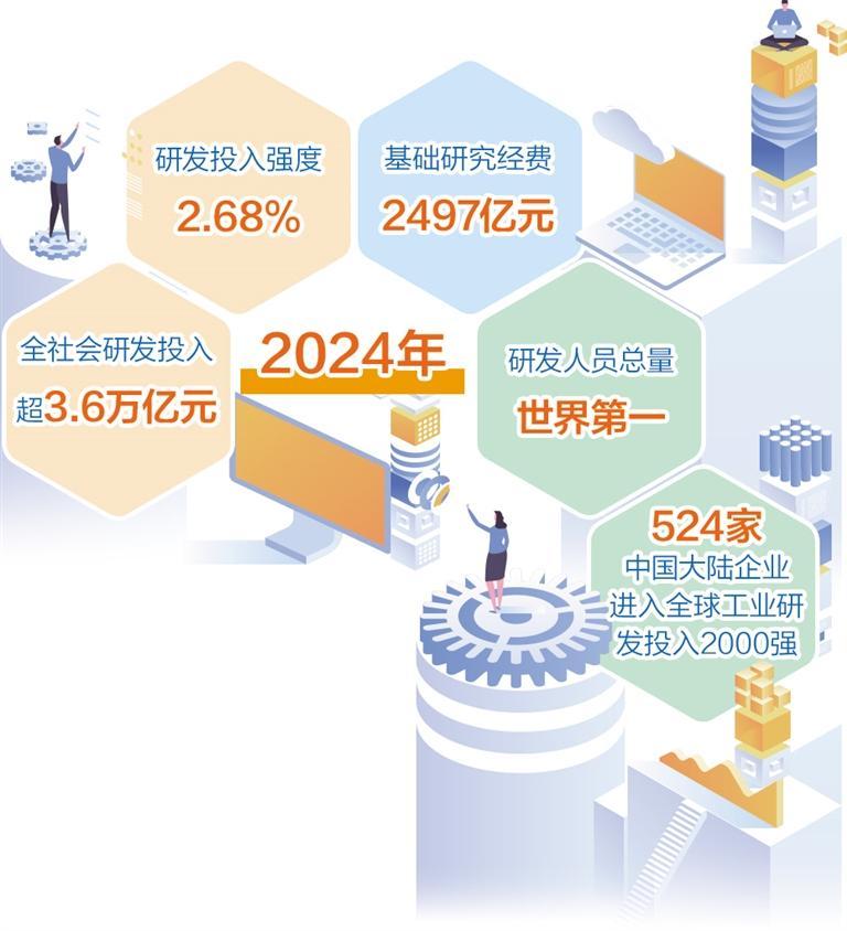 科技投入持續(xù)增加。2024年全社會研發(fā)投入超3.6萬億元,較2020年增長48%;研發(fā)投入強(qiáng)度達(dá)2.68%,超過歐盟國家平均水平;研發(fā)人員總量世界第一。基礎(chǔ)研究經(jīng)費(fèi)達(dá)2497億元,較2020年增長超過70%,在量子科技、生命科學(xué)、物質(zhì)科學(xué)、空間科學(xué)等領(lǐng)域取得一批重大原創(chuàng)性成果,高水平國際期刊論文數(shù)量和國際專利申請量連續(xù)5年世界第一。