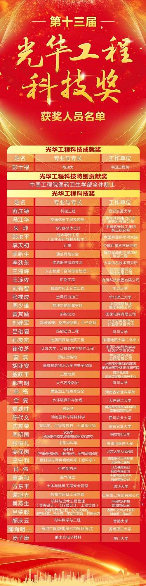 此外,還有機械工程專家蔣莊德、計量專家李天初、人工智能專家王海峰、特種功能金屬材料專家周少雄等不同學科領(lǐng)域的39位專家獲得光華工程科技獎,這些專家均以非凡的積極性和創(chuàng)造性,在各自領(lǐng)域取得了傲人成績,為我國工程科學技術(shù)事業(yè)的發(fā)展做出了巨大貢獻。