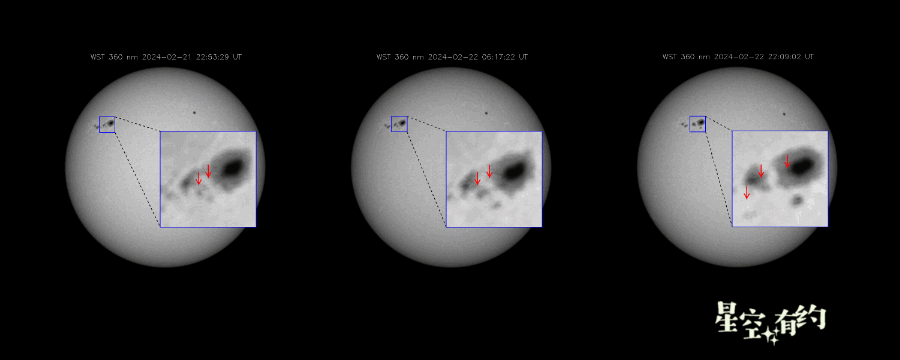 最近3個X級耀斑(22日X1.8級耀斑、22日X1.7級耀斑和23日X6.3級耀斑)發(fā)生時“夸父一號”白光望遠(yuǎn)鏡拍攝到的影像。(“夸父一號”研究團(tuán)隊供圖)