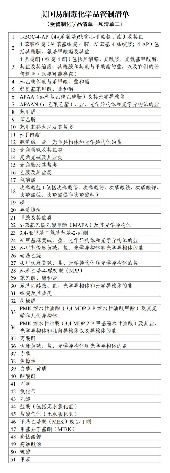 8.涉及美國管制化學(xué)品(品種詳見附件)的生產(chǎn)、經(jīng)營、進(jìn)出口企業(yè)和個(gè)人應(yīng)謹(jǐn)慎對(duì)待來自美國和墨西哥等相關(guān)國家的訂單,警惕出口物品被用于制造毒品和可能面臨的“長臂管轄”甚至“釣魚執(zhí)法”的風(fēng)險(xiǎn)。