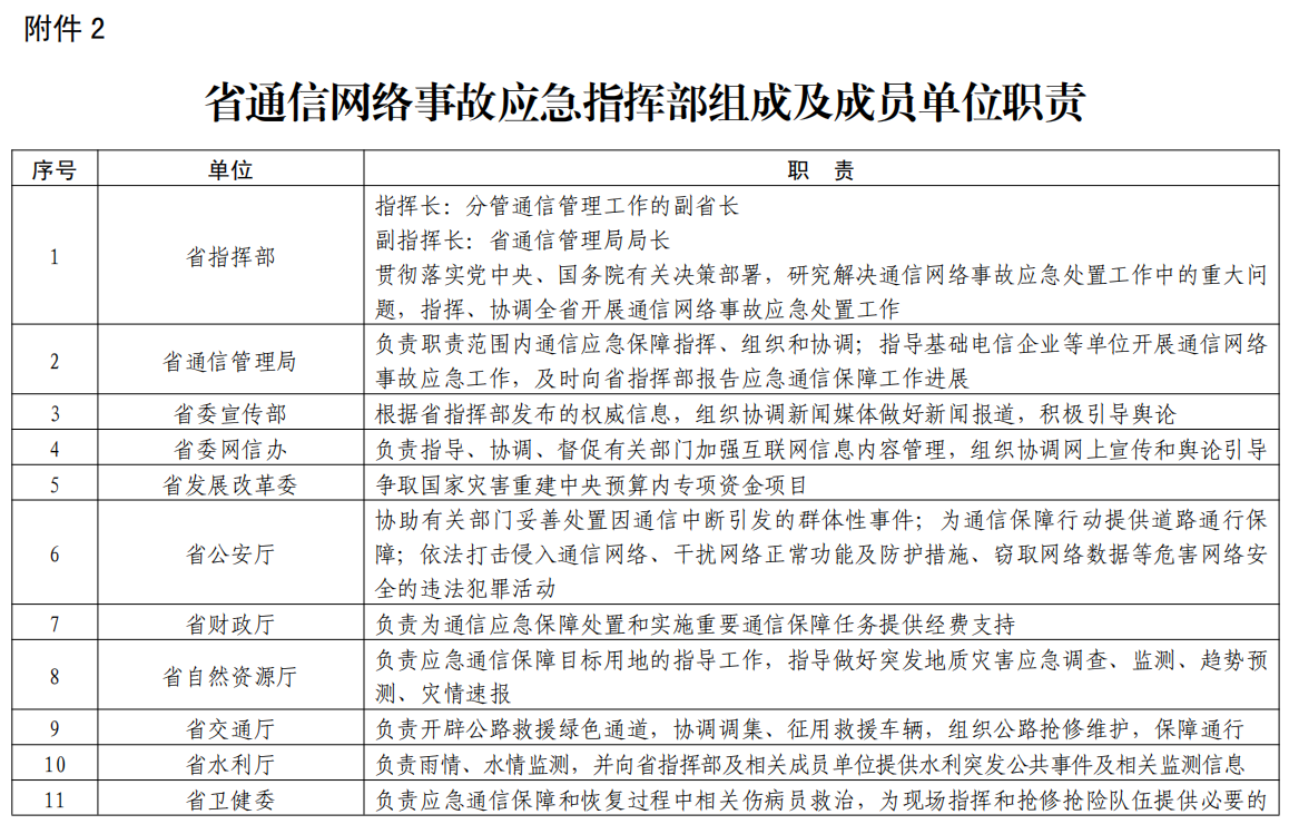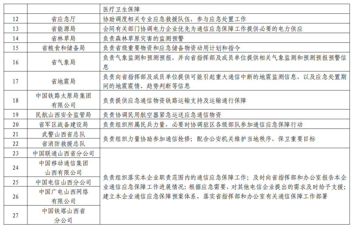 成員:省通信管理局、省委宣傳部、省委網信辦、省發(fā)展改革委、省公安廳、省財政廳、省自然資源廳、省交通廳、省水利廳、省衛(wèi)健委、省應急廳、省能源局、省林草局、省糧食和儲備局、省氣象局、省地震局、中國鐵路太原局集團有限公司、民航山西安全監(jiān)管局、省軍區(qū)戰(zhàn)備建設局、武警山西省總隊、省消防救援總隊以及省基礎電信企業(yè)等部門單位相關負責人。