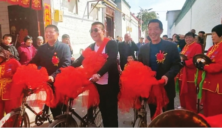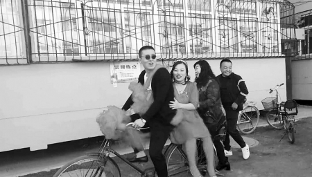 幾天前,這首“騎單車”歌曲里的情景,在太原市小店區(qū)小店街道杜家寨社區(qū)的一場(chǎng)婚禮上再現(xiàn)——新郎幸福地蹬著單車,后座上,美麗的新娘穿著紅色婚紗,甜蜜地靠在新郎背上,他們穿過(guò)社區(qū),在沿途眾多鄉(xiāng)鄰、親友的喝彩聲、祝福聲中,舉行了一場(chǎng)特別的單車婚禮。
