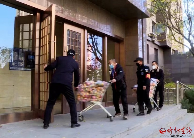大批裝袋整齊的水果包放在濱河一號(hào)小區(qū)樓下,多名物業(yè)工作人員推著便民購(gòu)物車(chē)來(lái)回忙碌著,大家統(tǒng)一佩戴口罩,嚴(yán)格做好防護(hù)措施,挨家挨戶(hù)送貨上門(mén),并全程避免與業(yè)主接觸,最大限度地保護(hù)廣大群眾的健康與安全。