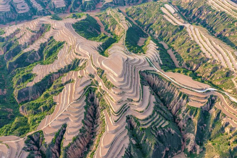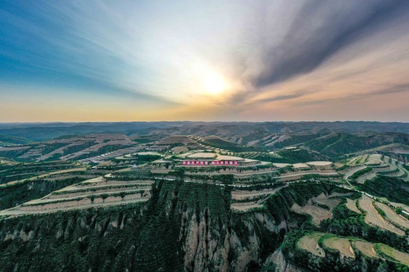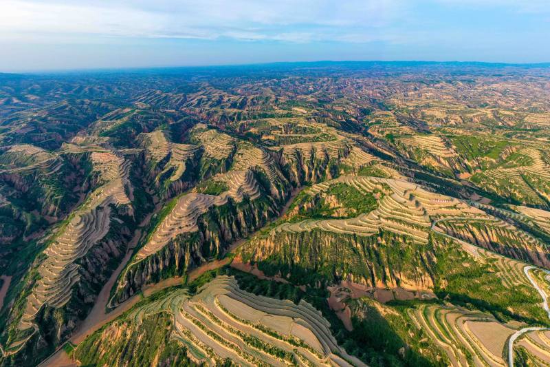 站在永和梯田觀景臺上,一壟壟地膜像一條條白色的絲帶,纏繞在層層疊疊的梯田間。連綿的山坡間、山塬上,鋪滿了綠色的盛裝——油松、連翹,還有地里的高粱苗,正孕育著無限的生機(jī)活力。