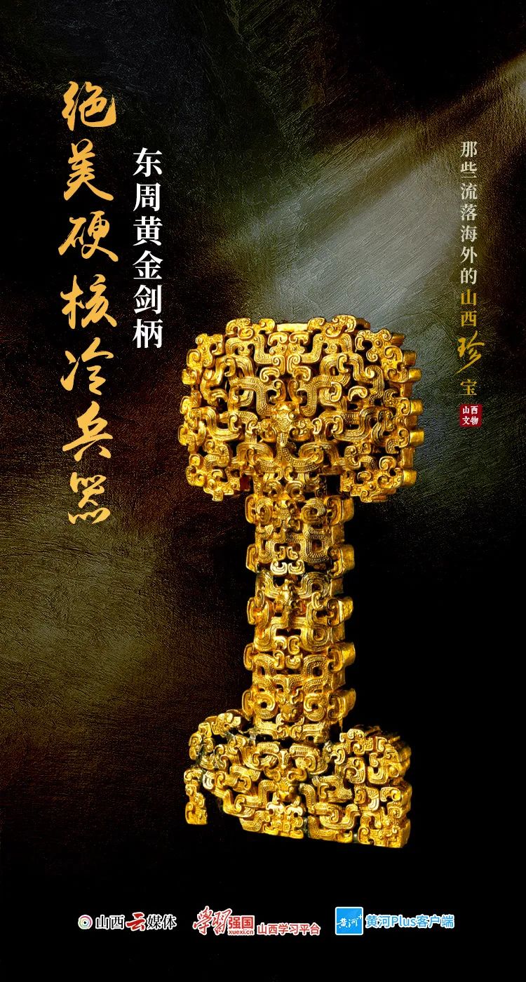 這把黃金劍柄,制作于公元前6至5世紀,長度9.8厘米,為鏤空雕刻蟠虺紋,做工精細,華麗異常。