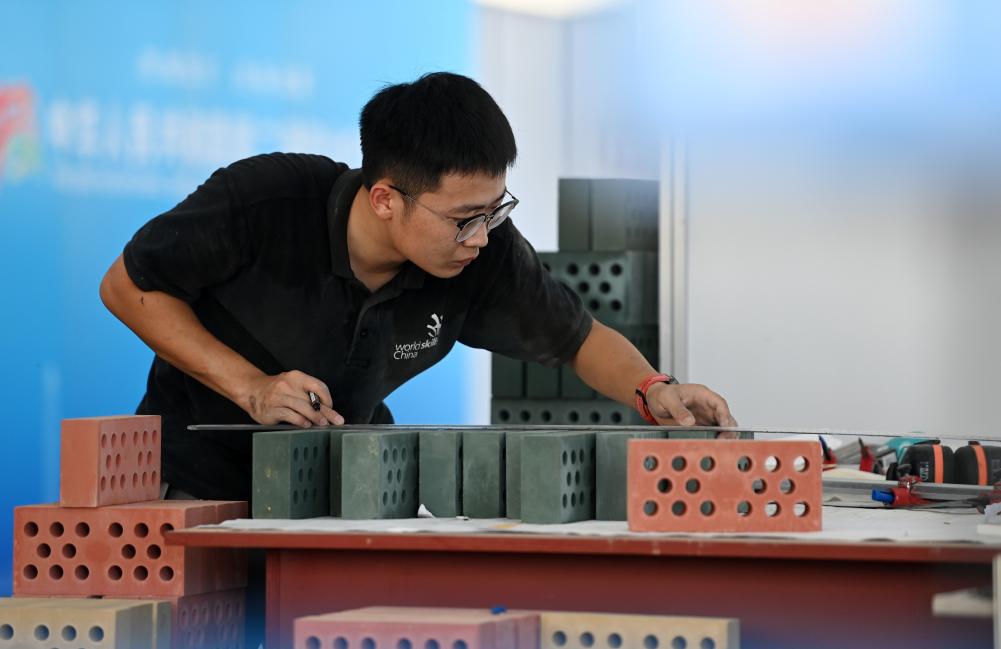 2023年9月17日,在國家會展中心(天津)舉辦的中華人民共和國第二屆職業(yè)技能大賽進(jìn)入第二天,參賽選手在參加砌筑項目比賽。新華社記者 趙子碩 攝