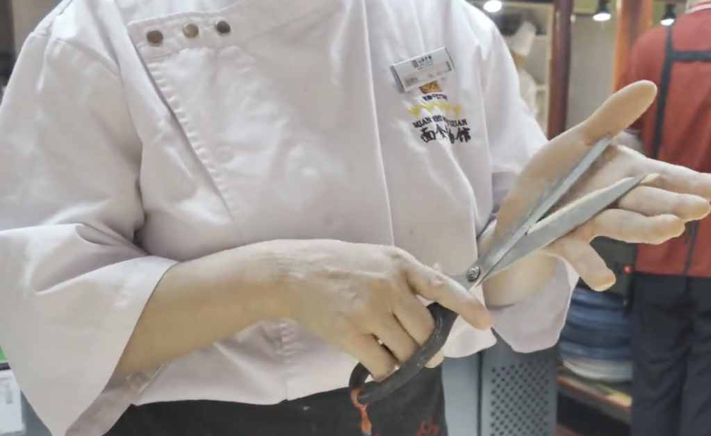 圖為夾心面。新華社記者 王怡靜 攝??關于剪刀面的故事很動人——“‘剪子面,兩頭尖,吃到肚里胃不酸’。相傳剪刀面是以前喬家大院的喬貴發(fā)走西口的時候,留在家里的妻子為丈夫裁剪衣服,由于過于思念丈夫,一走神就把剪刀也帶到了廚房里,于是便有了剪子面?!覆凰帷?,其實也是‘心不酸’。”李琨說。剪刀面一般用來做湯面,配蔬菜吃,也有著希望家人安康的寄托。