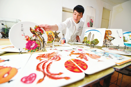 在阿峰工作室內(nèi),擺放著很多這幾年他精心制作的果醬畫作品,在方形和圓形的瓷盤上,有風(fēng)景、動(dòng)物、建筑……每一幅都栩栩如生,不僅細(xì)膩美觀,還可食用?!捌饺绽?,我除了工作,最喜歡在安靜的時(shí)候琢磨,有時(shí)為了一個(gè)作品要花上五六個(gè)小時(shí)來(lái)創(chuàng)作。果醬畫讓我大開(kāi)眼界,不僅能畫出流暢的線條,還能畫出五彩斑斕的世界,更讓我找到了人生的目標(biāo)。”阿峰介紹。