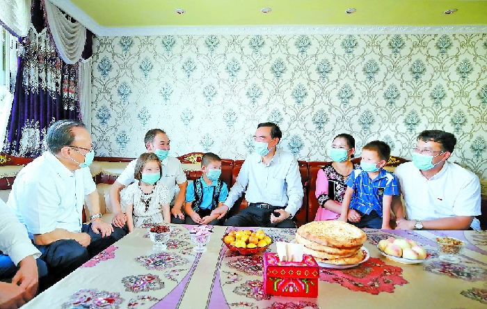 日前,自治區(qū)黨委書(shū)記陳全國(guó),自治區(qū)黨委副書(shū)記、自治區(qū)主席雪克來(lái)提·扎克爾在克孜勒蘇柯?tīng)柨俗巫灾沃菡{(diào)研統(tǒng)籌推進(jìn)常態(tài)化疫情防控和經(jīng)濟(jì)社會(huì)發(fā)展工作。這是陳全國(guó)、雪克來(lái)提·扎克爾在阿克陶縣絲路佳苑易地扶貧搬遷安置點(diǎn),走進(jìn)建檔立卡貧困戶(hù)穆拉提·艾海提家中,關(guān)心詢(xún)問(wèn)搬遷后的生活情況,勉勵(lì)他們持續(xù)增收致富,把日子越過(guò)越好。 崔志堅(jiān)攝