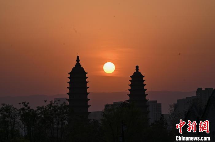 4月17日,山西省太原市,夕陽與百年古剎永祚寺雙塔相互映襯,現(xiàn)“雙塔落日”景觀。 中新社記者 韋亮 攝