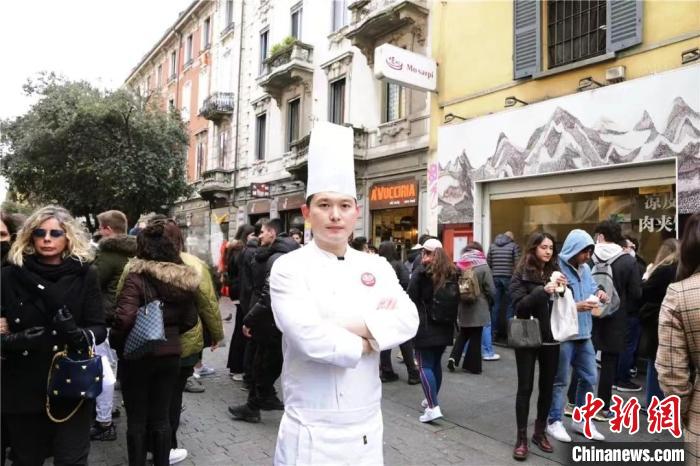 在意大利米蘭華人街,一家中國(guó)小吃店門前排著長(zhǎng)隊(duì)。玻璃櫥窗后的操作間里,廚師撈出剛煮好的臘汁肉,切成肉燥,現(xiàn)烙的白吉饃從中切開,填入肉燥后再淋上肉汁,這饃酥肉香的肉夾饃,吸引食客們?cè)诼愤叴罂於漕U。