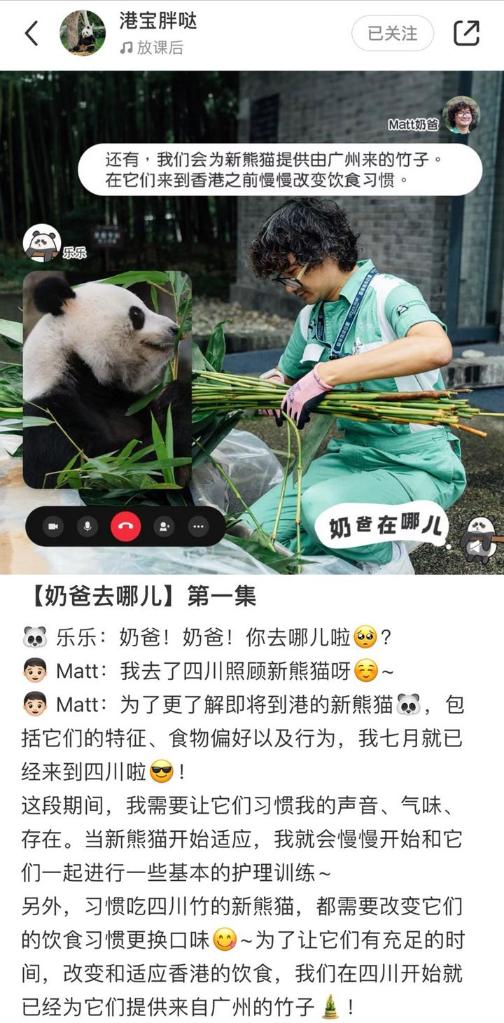 為了解新赴港大熊貓的特征、食物偏好以及行為,香港海洋公園的大熊貓護(hù)理員梁家綸7月已抵達(dá)四川,讓大熊貓們習(xí)慣他的聲音、氣味、存在,大熊貓適應(yīng)后,他開(kāi)始和它們一起進(jìn)行基本護(hù)理訓(xùn)練。