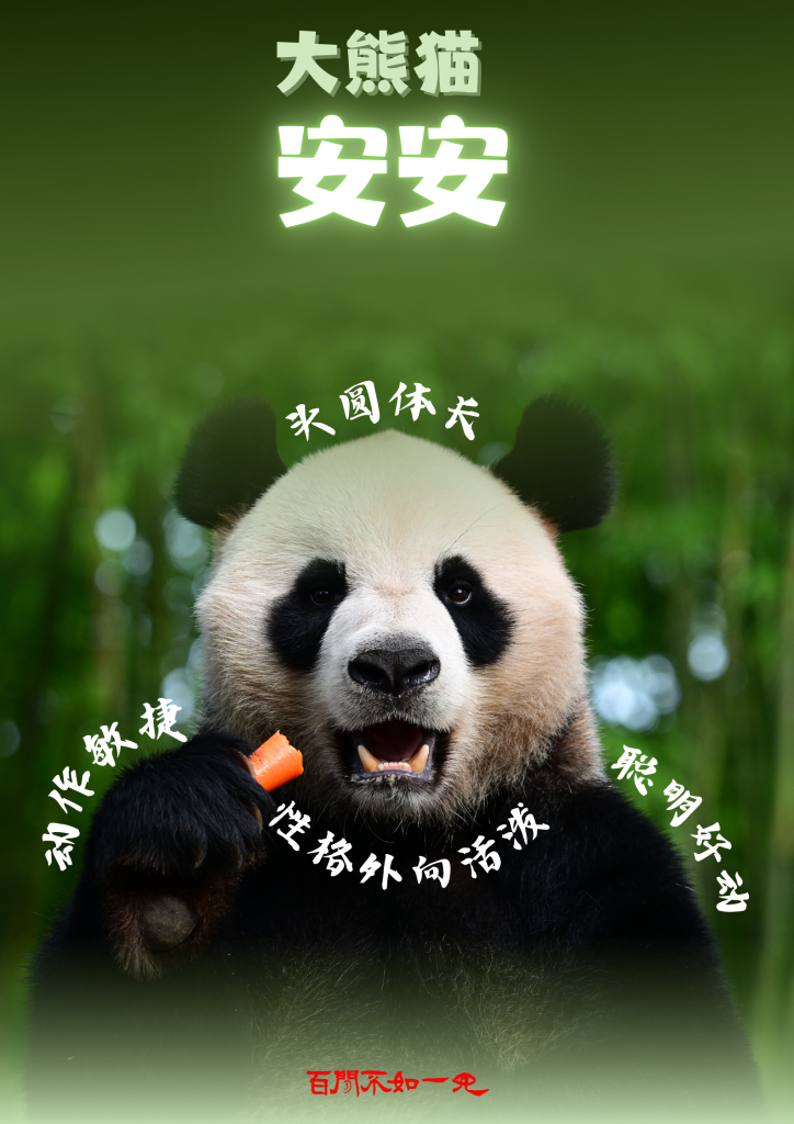 大熊貓“安安”,雄性,2019年6月出生,頭圓體長(zhǎng),動(dòng)作敏捷,聰明好動(dòng),性格外向活潑。