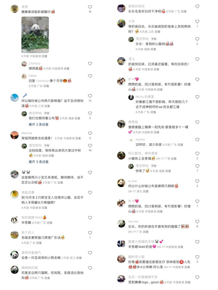 可愛(ài)的國(guó)寶牽動(dòng)眾多“熊貓迷”的心,隨著贈(zèng)港大熊貓消息的更新,網(wǎng)友們熱議的話題從“新熊貓是誰(shuí)”“新熊貓何時(shí)能看到”,變成了“等‘奶爸’回去,樂(lè)樂(lè)能聞到‘奶爸’身上其他熊味嗎”“照顧6只熊貓人手夠嗎”“給新熊貓起什么新名字”……