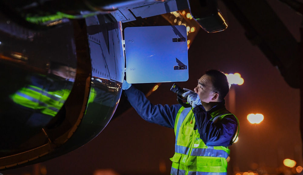 1月11日,在??诿捞m國際機(jī)場(chǎng)停機(jī)坪上,南航工程技術(shù)分公司機(jī)務(wù)工程師對(duì)飛機(jī)進(jìn)行深度檢查。新華社記者 楊冠宇 攝