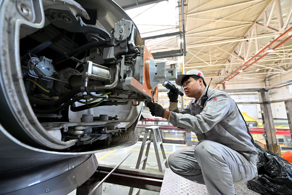 1月9日,在太原動(dòng)車組運(yùn)用所,動(dòng)車組機(jī)械師對(duì)列車的車頭單元進(jìn)行檢查維護(hù)。新華社記者 詹彥 攝