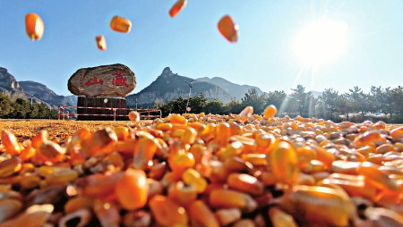 從空中俯瞰,景區(qū)標志性的刻有“藏山”字樣的巨石,被連片的玉米“花?!杯h(huán)繞,綿延千米的道路上,玉米粒被村民們精心鋪成整齊的波紋狀,宛如一條流淌的金色長河?!敖衲昃皡^(qū)把這么寬的路讓給我們晾曬糧食,真的解決了我們一大難題!”正在翻曬玉米的村民李師傅說道。