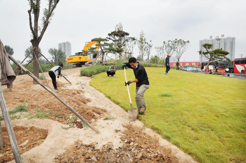 9月14日,原平市高速路口兩側(cè)的綠化工作正在如火如荼地進(jìn)行著。挖掘機(jī)揮舞著鐵臂挖掘土壤,數(shù)十名工人忙碌著搬運(yùn)花草,栽植樹木。據(jù)了解,該市今年綠化工程總投資1.3億元,對范亭廣場、原平經(jīng)濟(jì)技術(shù)開發(fā)區(qū)、高速路口兩側(cè)及新華廣場、崞紅線進(jìn)行綠化提升改造,喬、灌、花、草合理組配,達(dá)到增層、增色、增花的效果。(褚 震 攝)