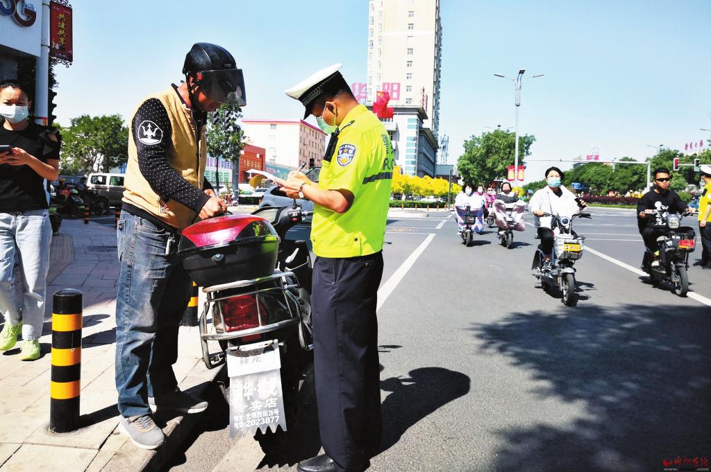 個(gè)別市民為了搶幾十秒時(shí)間,少走幾百米路,騎電動(dòng)車闖紅燈、逆行,結(jié)果收到交警的罰單。5月27日,在城區(qū)建設(shè)路與長(zhǎng)征街路口,執(zhí)勤交警一邊開(kāi)罰單,一邊苦口婆心地勸說(shuō)交通違法者:“為了自己和他人的安全,一定要遵守交通法規(guī),摒棄交通陋習(xí),遠(yuǎn)離交通事故?!保ㄓ浾?張劍雄 攝)