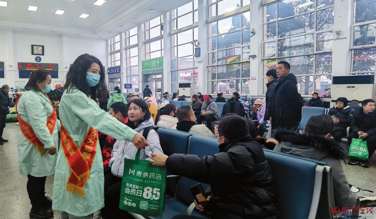 近日,國(guó)內(nèi)知名藥企廣州白云山和記黃埔中藥有限公司攜手我市當(dāng)?shù)厮幤箝_展春運(yùn)愛心公益活動(dòng)。圖為工作人員在忻州火車站向候車乘客發(fā)放防流感藥品、口罩等健康禮包。(李建中攝)