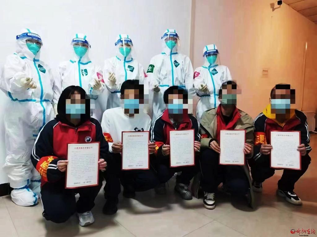 “大白”與方艙內(nèi)志愿者服務(wù)榮譽證書的獲得者在一起