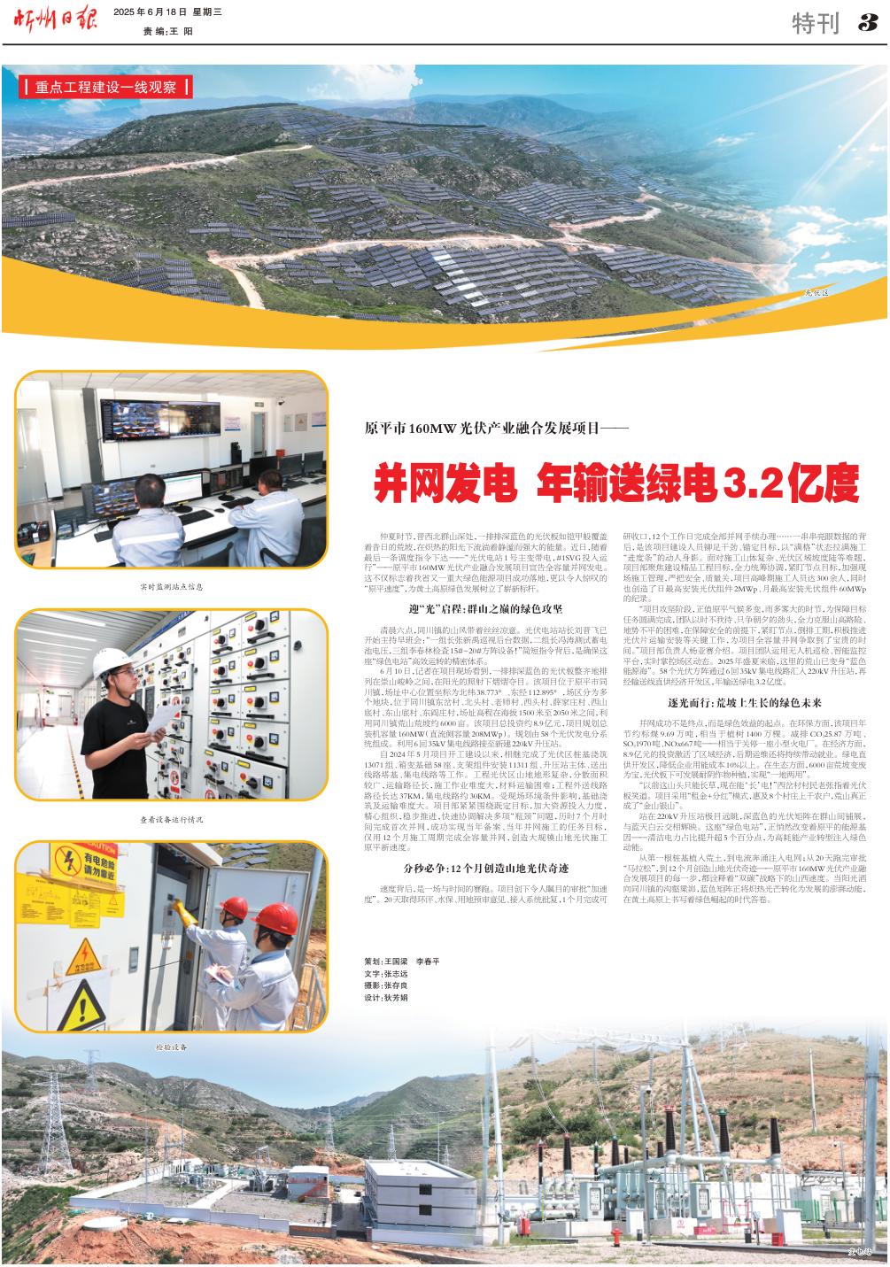 “項目攻堅階段,正值原平氣候多變,雨多霧大的時節(jié),為保障目標任務圓滿完成,團隊以時不我待、只爭朝夕的勁頭,全力克服山高路險、地勢不平的困難,在保障安全的前提下,緊盯節(jié)點,倒排工期,積極推進光伏片運輸安裝等關(guān)鍵工作,為項目全容量并網(wǎng)爭取到了寶貴的時間?!表椖坎控撠熑藯顏嗁惤榻B。項目團隊運用無人機巡檢、智能監(jiān)控平臺,實時掌控場區(qū)動態(tài)。2025年盛夏來臨,這里的荒山已變身“藍色能源?!?。58個光伏方陣通過6回35kV集電線路匯入220kV升壓站,再經(jīng)輸送線直供經(jīng)濟開發(fā)區(qū),年輸送綠電3.2億度。