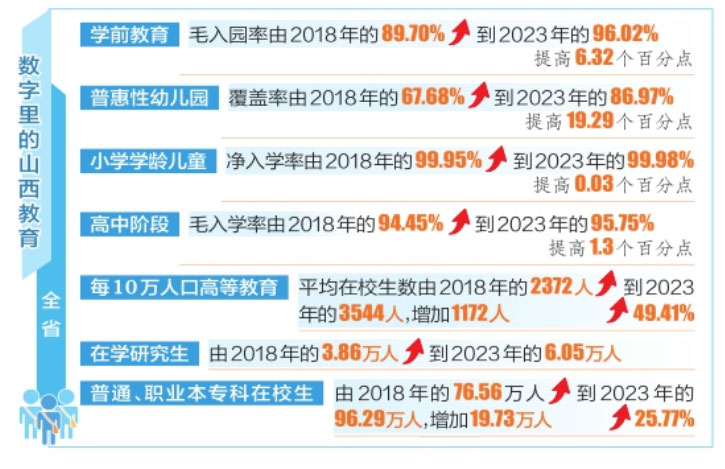 全省普惠性幼兒園覆蓋率從2020年的84.83%提高至2023年的86.97%,其中大同市達到96.63%,位列全省第一;學前教育毛入園率從2020年的90.8%提高至2023年的96.02%,高出全國平均水平4.92個百分點。小學、初中學齡兒童凈入學率分別保持在99.95%、99.66%以上,高中階段毛入學率2023年提升至95.75%,并率先實現(xiàn)20萬人口以上的縣特殊教育學校全覆蓋,控輟保學從動態(tài)清零轉向常態(tài)清零,“有學上”問題得到全面解決。