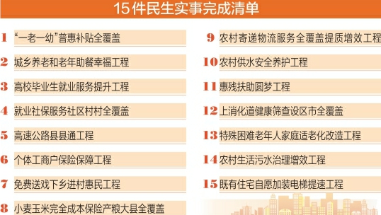 15件民生實(shí)事件件關(guān)乎民生福祉,涉及養(yǎng)老托育、就業(yè)社保、疾病篩查、鄉(xiāng)村振興、環(huán)境治理等百姓家事和發(fā)展大事,著眼解決群眾急難愁盼問題,著力補(bǔ)齊城鄉(xiāng)公共服務(wù)短板,加強(qiáng)普惠性、基礎(chǔ)性、兜底性民生建設(shè),切實(shí)增強(qiáng)群眾獲得感幸福感安全感。