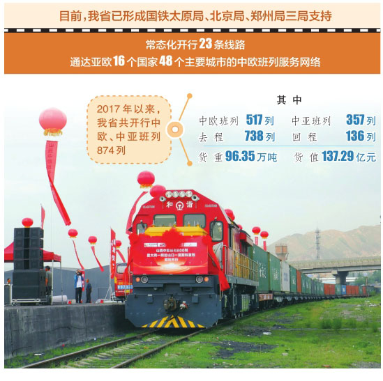 目前,我省已形成國鐵太原局、北京局、鄭州局三局支持,以晉中中鼎物流園、臨汾方略陸港、大同平旺、陽泉白羊墅、長治長鋼綠能物流園、太原皇后園、呂梁文水海威以及朔州、應(yīng)縣等啟運站點,經(jīng)滿洲里、二連浩特、阿拉山口、霍爾果斯、磨憨等5個口岸,常態(tài)化開行23條線路,通達亞歐16個國家48個主要城市的中歐班列服務(wù)網(wǎng)絡(luò)。