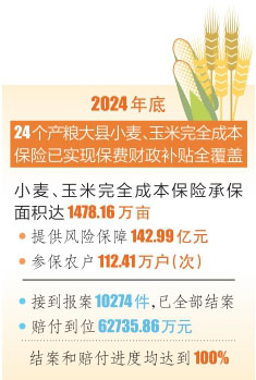 2024年政府工作報(bào)告將“在產(chǎn)糧大縣實(shí)施小麥玉米完全成本保險(xiǎn)財(cái)政補(bǔ)貼全覆蓋”列為全省15件民生實(shí)事之一,小麥、玉米完全成本保險(xiǎn)和收入保險(xiǎn)在24個(gè)產(chǎn)糧大縣全面推開,綜合承保覆蓋率達(dá)90.63%,受到試點(diǎn)縣種糧農(nóng)戶高度肯定,在穩(wěn)定糧食生產(chǎn)方面發(fā)揮了積極作用。一年來,各相關(guān)部門以高度的責(zé)任心和使命感,將民生實(shí)事抓細(xì)抓實(shí)、扎實(shí)推進(jìn),確保任務(wù)圓滿完成。2024年底,24個(gè)產(chǎn)糧大縣小麥、玉米完全成本保險(xiǎn)已實(shí)現(xiàn)保費(fèi)財(cái)政補(bǔ)貼全覆蓋。小麥、玉米完全成本保險(xiǎn)承保面積達(dá)1478.16萬畝,提供風(fēng)險(xiǎn)保障142.99億元,參保農(nóng)戶112.41萬戶(次)。接到報(bào)案10274件,已全部結(jié)案,賠付到位62735.86萬元,結(jié)案和賠付進(jìn)度均達(dá)到100%。
