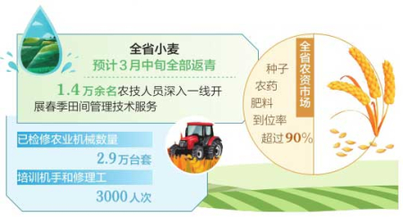 全省農(nóng)資市場(chǎng)備貨充足,價(jià)格穩(wěn)中有降。目前,種子、農(nóng)藥、肥料到位率超過90%。全省已檢修農(nóng)業(yè)機(jī)械數(shù)量2.9萬臺(tái)套,培訓(xùn)機(jī)手和修理工3000人次。