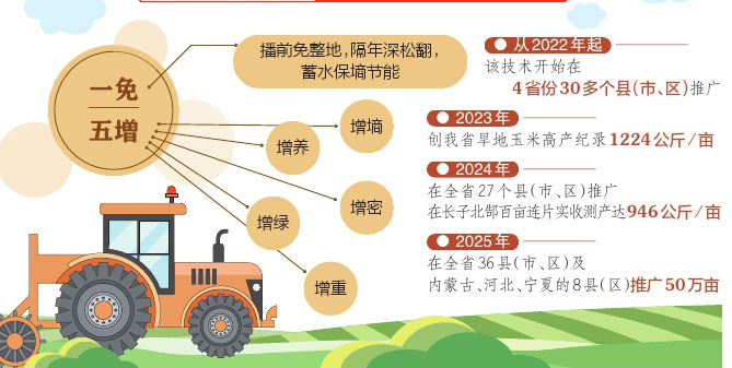 “一免五增”藝機(jī)一體化技術(shù)由山西農(nóng)大(省農(nóng)科院)有機(jī)旱作農(nóng)業(yè)研究院任志強(qiáng)科研團(tuán)隊(duì)實(shí)踐研發(fā)。其核心理念是通過(guò)農(nóng)藝農(nóng)機(jī)結(jié)合、良種良法配套,有效提高作物抗旱出苗、蓄水保墑和水肥利用率,秸稈自然腐熟,增強(qiáng)抗病性和抗倒性,從而通過(guò)增加密度助力單產(chǎn)提升,實(shí)現(xiàn)節(jié)本提質(zhì)增效和綠色可持續(xù)生產(chǎn)。該技術(shù)針對(duì)半干旱地區(qū)玉米生產(chǎn)中出苗難、秸稈還田成本高、機(jī)械作業(yè)成本高等問(wèn)題,依托一體化農(nóng)機(jī)具實(shí)施保護(hù)性耕作,從而實(shí)現(xiàn)“一免五增”。“一免”即播前免整地,隔年深松翻,蓄水保墑節(jié)能。“五增”即“增墑”,溝播探墑,壟溝集雨,抗旱保苗;“增養(yǎng)”,秸稈歸壟腐熟,菌肥同播,培肥地力;“增密”,增株抗倒耐密,增加畝穗數(shù);“增綠”,測(cè)土分次施肥,增加穗粒數(shù),機(jī)械除草節(jié)肥藥;“增重”,一噴多促,延遲收獲增粒重。