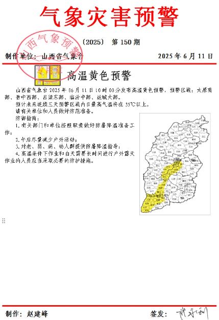 山西省氣象臺(tái)2025年06月11日10時(shí)00分發(fā)布高溫黃色預(yù)警,預(yù)警區(qū)域:太原南部、晉中西部、呂梁東部、臨汾中部、運(yùn)城大部。