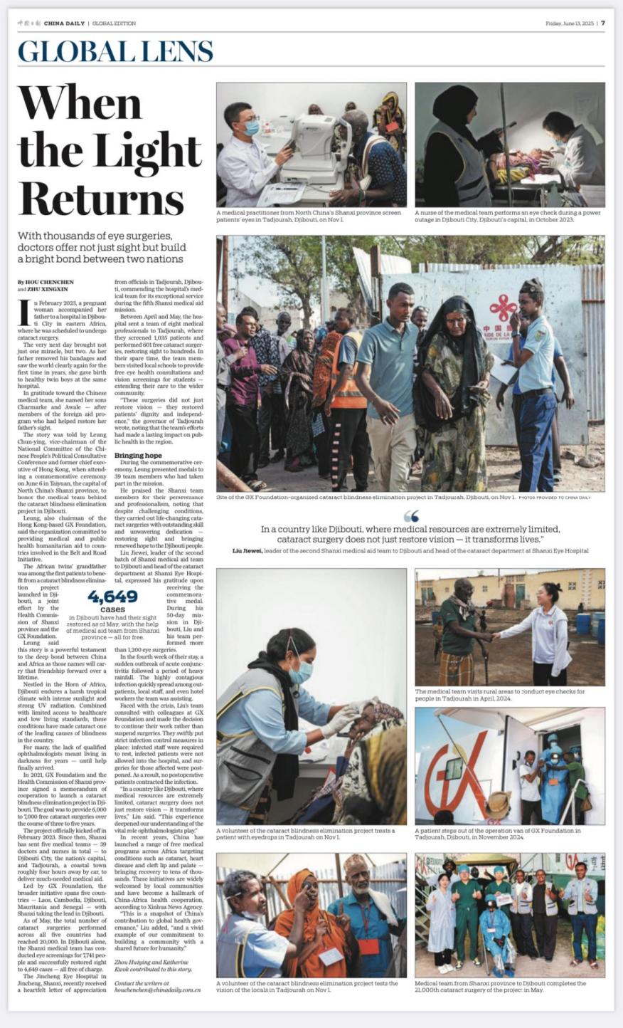 《中國日報國際版》6月13日第7版Global Lens欄目截圖數(shù)千例眼科手術(shù)背后,山西援外醫(yī)療隊醫(yī)生們不僅為非洲患者重賦光明,更在兩國間架起友誼之橋。