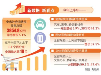 數(shù)據(jù)顯示,上半年,全省社會消費品零售總額3854.8億元,同比增長6.1%,較一季度加快0.2個百分點,高于全國平均水平(5.0%)1.1個百分點,全國排名第10位,消費主引擎作用日益凸顯,為全省經(jīng)濟高質(zhì)量發(fā)展提供有力支撐。