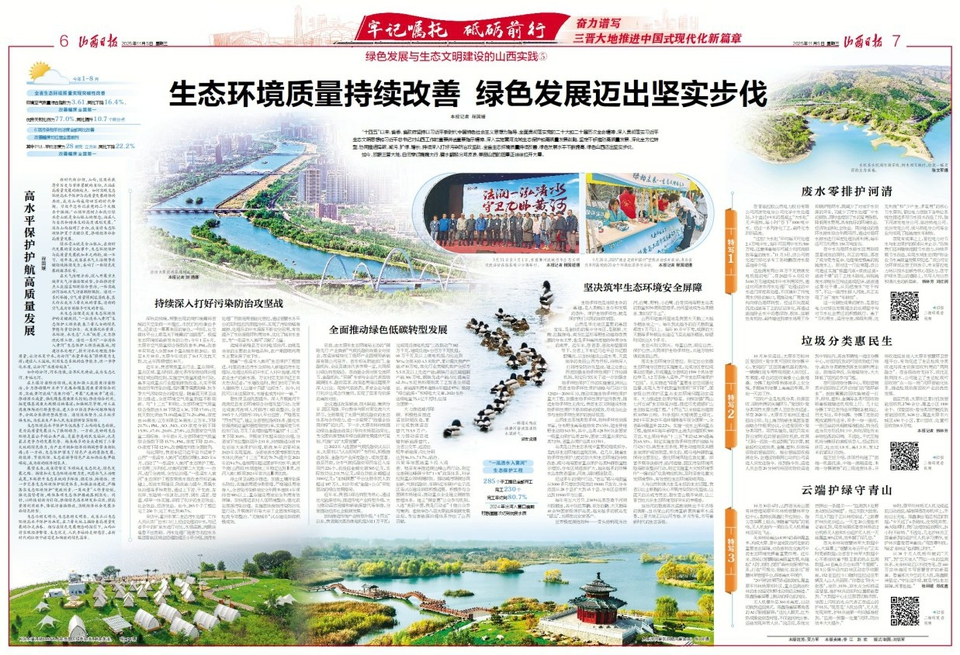 掃描二維碼觀看視頻 “十四五”以來,省委、省政府堅(jiān)持以習(xí)近平新時(shí)代中國特色社會(huì)主義思想為指導(dǎo),全面貫徹落實(shí)黨的二十大和二十屆歷次全會(huì)精神,深入貫徹落實(shí)習(xí)近平生態(tài)文明思想和習(xí)近平總書記對(duì)山西工作的重要講話重要指示精神,深入實(shí)施黃河流域生態(tài)保護(hù)和高質(zhì)量發(fā)展戰(zhàn)略,堅(jiān)定不移推動(dòng)高質(zhì)量發(fā)展、深化全方位轉(zhuǎn)型,協(xié)同推進(jìn)降碳、減污、擴(kuò)綠、增長,持續(xù)深入打好污染防治攻堅(jiān)戰(zhàn),全省生態(tài)環(huán)境質(zhì)量持續(xù)改善,綠色發(fā)展水平不斷提高,綠色山西邁出堅(jiān)實(shí)步伐。 如今,放眼三晉大地,白云穿過巍巍太行,碧水翻起汾河波浪,美麗山西的圖景正徐徐拉開大幕。 持續(xù)深入打好污染防治攻堅(jiān)戰(zhàn) 深秋的傍晚,頻繁出現(xiàn)的絢爛晚霞將省城的天空染得一片橙紅,市民們紛紛拿出手機(jī),記錄這一幕幕美麗的景色,一時(shí)間,社交媒體平臺(tái)上都是關(guān)于晚霞的“油畫圖”。根據(jù)生態(tài)環(huán)境部最新發(fā)布的公告:今年1至6月,太原市空氣質(zhì)量綜合指數(shù)改善率、PM2.5改善率雙雙進(jìn)入全國168個(gè)重點(diǎn)城市前20位。截至8月18日,太原今年收獲了161天優(yōu)良天數(shù),比去年同期增加30天。 近年來,我省聚焦重點(diǎn)行業(yè)、重點(diǎn)領(lǐng)域、重點(diǎn)區(qū)域、重點(diǎn)時(shí)段,強(qiáng)化多污染物協(xié)同治理和區(qū)域協(xié)同控制,實(shí)施空氣質(zhì)量再提升行動(dòng),基本完成重點(diǎn)行業(yè)超低排放改造,扎實(shí)開展柴油貨車污染治理,組織夏季臭氧削峰、秋冬季大氣污染綜合治理攻堅(jiān)。隨著藍(lán)天保衛(wèi)戰(zhàn)加力推進(jìn),全省環(huán)境空氣質(zhì)量數(shù)據(jù)不斷刷新。與“十三五”末相比,全省環(huán)境空氣質(zhì)量綜合指數(shù)由5.18下降至4.30,下降17.0%;優(yōu)良天數(shù)比例由71.0%提高至74.2%;PM2.5濃度由46微克/立方米降至36微克/立方米,下降21.7%;PM10、SO2、NO2、CO濃度分別下降15.9%、47.4%、20.0%、27.8%,達(dá)到國家空氣質(zhì)量二級(jí)標(biāo)準(zhǔn)。今年前4月,全省環(huán)境空氣質(zhì)量綜合指數(shù)下降15.7%、PM2.5濃度下降22.4%、O3濃度下降12.9%,改善幅度均在全國前列。 與此同時(shí),我省牢記習(xí)近平總書記寄予山西“一泓清水入黃河”的殷切期盼,2023年6月,啟動(dòng)了“一泓清水入黃河”生態(tài)保護(hù)工程,計(jì)劃用三年時(shí)間,對(duì)黃河的第二大支流——汾河,進(jìn)行全流域、全方位治理?!耙汇逅朦S河”生態(tài)保護(hù)工程在聚焦水質(zhì)改善目標(biāo)的基礎(chǔ)上,銜接水網(wǎng)建設(shè)、防洪能力提升、黑臭水體治理等多種類型,通過上下游、干支流、左右岸、水陸域一體謀劃,治污、調(diào)水、清淤、增濕、綠岸一體實(shí)施,取得了初步的生態(tài)效益、社會(huì)效益、經(jīng)濟(jì)效益。如今,285個(gè)子工程已完工230個(gè)、完工率達(dá)到80.7%。 采訪中,霍州市第二生活污水處理廠工作人員從該廠出水口打上經(jīng)過處理的中水,與記者手中的礦泉水進(jìn)行對(duì)比,水質(zhì)清澈,肉眼絲毫看不出差別。污水處理廠運(yùn)營方北控水務(wù)集團(tuán)晉臨區(qū)域總經(jīng)理助理王小平介紹,該污水處理廠目前運(yùn)用智能化管控,通過智慧水務(wù)平臺(tái)的實(shí)時(shí)監(jiān)控與數(shù)據(jù)分析,實(shí)現(xiàn)了污染物精準(zhǔn)減排,處理后的中水源源不斷安全回用,有效提升了水資源循環(huán)利用效率,優(yōu)化了城市水生態(tài),為“一泓清水入黃河”貢獻(xiàn)了力量。 運(yùn)城市新絳縣萬安村毗鄰汾河,油桃是當(dāng)?shù)氐闹饕r(nóng)業(yè)種植品種,農(nóng)戶果園噴藥用水主要來源于地下水。 隨著“一泓清水入黃河”生態(tài)保護(hù)工程推進(jìn),村里的生活污水全部納入新建的污水處理站,處理達(dá)標(biāo)后的中水匯入村中池塘,成為農(nóng)業(yè)生產(chǎn)的新水源。萬安村黨支部書記王豐太告訴記者:“水塘改造時(shí),我們封閉了所有入塘排污口,讓塘中只留‘達(dá)標(biāo)水’。如今,村民可以來這里取水,水塘也成為村中一景?!?/p> 碧水保衛(wèi)戰(zhàn)鞏固提升。深入開展黃河干流流經(jīng)縣生態(tài)環(huán)境綜合治理攻堅(jiān)行動(dòng),全面完成黃河流域入河排污口排查整治,全省3915個(gè)入河排污口納入平臺(tái)監(jiān)管。嚴(yán)格落實(shí)“四水四定”,建立全省管控指標(biāo)體系,強(qiáng)化水資源消耗總量和強(qiáng)度剛性約束,實(shí)施深度節(jié)水控水行動(dòng),萬元工業(yè)增加值用水量較“十三五”末下降30.0%。開展地下水超采綜合治理,全省地下水位整體回升2.51米,持續(xù)推進(jìn)全省19處巖溶大泉保護(hù)治理,斷流30年的晉祠泉2023年實(shí)現(xiàn)復(fù)流。全省地表水國考斷面優(yōu)良水體比例由“十三五”末的70.7%提升至2024年的94.7%,連續(xù)兩年超過國家平均水平,黃河干流(山西段)水質(zhì)連續(xù)三年穩(wěn)定達(dá)到Ⅱ類,汾河入黃口斷面2024年首次達(dá)Ⅲ類優(yōu)良。 凈土保衛(wèi)戰(zhàn)穩(wěn)步推進(jìn)。加強(qiáng)土壤污染源頭防控,實(shí)施農(nóng)用肥分類管理,嚴(yán)格